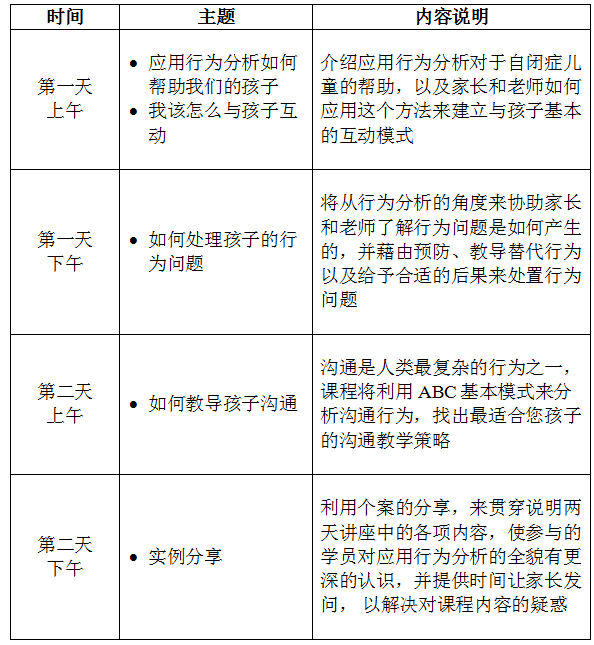 本讲座为应用行为分析三部曲的第一部分,主要对象为自闭症谱系儿童的家长和老师,于讲座中将藉由讲解、影片示范及现场实操的方式,让参与的家长和老师们了解应用行为分析的基本概念与教学中的实际运用,并将这个方法用于自己的孩子身上,来加快孩子的学习效率及减少孩子的行为问题。
